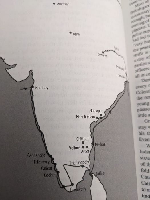 With respect to the map, his India journey began in Bombay, where he traveled southwards by land and sea along the west coast unto near India’s southernmost tip before turning inland via Tinnevelly (a centre of fascinating interest that deserve its own account). He crossed the south of the eastern of India’s two Southern states, Tamil Nadu (the other being Kerala), including spending time in Ceylon (Sri Lanka), reaching and spending time in TN’s state capital (Madras). He then continued journeying, this time following India’s east coast, before ending up in Calcutta (which at the time was the capital of British India) where he established his base and from where he started his sea journey back to Britain. But not before visiting William Carey at his Serampore base just prior to the great man’s death (we find that ANG was impressed by the dedication of Carey and his Baptist associates in their missionary endeavours).