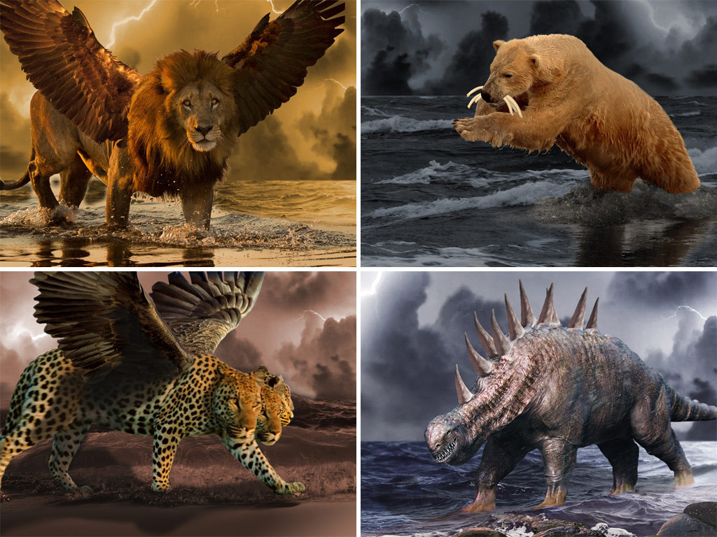 While some explanation was given to Daniel concerning what he dreamt, it was not enough to identify which kings and kingdoms were being referred to. One popular interpretation has been that the four beasts corresponded to the four parts of the statue that Nebuchadnezzar dreamt about (see Daniel 2) that most would identify as comprising Babylon (gold – head), Persia (silver – upper body), Greece (bronze – lower body) and Rome (iron – legs), with the ten toe mix of iron and clay being (it has been argued) a revived Roman Empire that will be overtaken by Christ’s everlasting kingdom. Others, including me, have questioned making such a parallel, again begging the question of the identity of the four beasts. My own thought, especially in the light of current events that have only arisen in recent years, especially in the light of globalism, is that the lion/eagle represents the UK/USA, the bear represents Russia, the leopard represents the Muslim world centred around the Middle East and the fourth beast that has no identity (some have referred to it as a griffin) being the Antichrist kingdom taking in ten global regions, possibly around Europe. But then I could be very wrong, although I expect a time will come when we will know.
