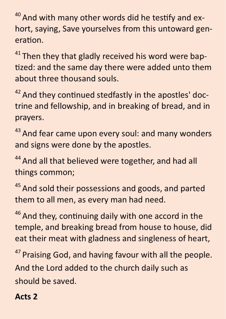 42 All the believers devoted themselves to the apostles’ teaching, and to fellowship, and to sharing in meals (including the Lord’s Supper), and to prayer. 43 A deep sense of awe came over them all, and the apostles performed many miraculous signs and wonders. 44 And all the believers met together in one place and shared everything they had. 45 They sold their property and possessions and shared the money with those in need. 46 They worshiped together at the Temple each day, met in homes for the Lord’s Supper, and shared their meals with great joy and generosity 47 all the while praising God and enjoying the goodwill of all the people. And each day the Lord added to their fellowship those who were being saved (New Living Translation).