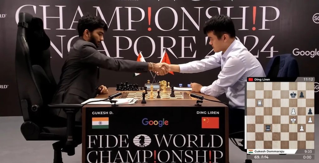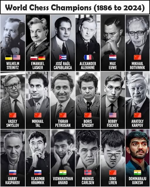 According to Wikipedia: “The World Chess Championship 2024, officially known as the World Chess Championship 2024 presented by Google, was a chess match between the reigning world champion Ding Liren and the challenger Gukesh Dommaraju to determine the World Chess Champion. The match took place between 25 November and 12 December 2024 in Singapore. It was played to a best of 14 games, with tiebreaks if required. The match was won by Gukesh 7½–6½ after 14 games. The win made Gukesh the 18th undisputed World Champion and, at age 18, the youngest of them”, and like many chess fans I have been following it.