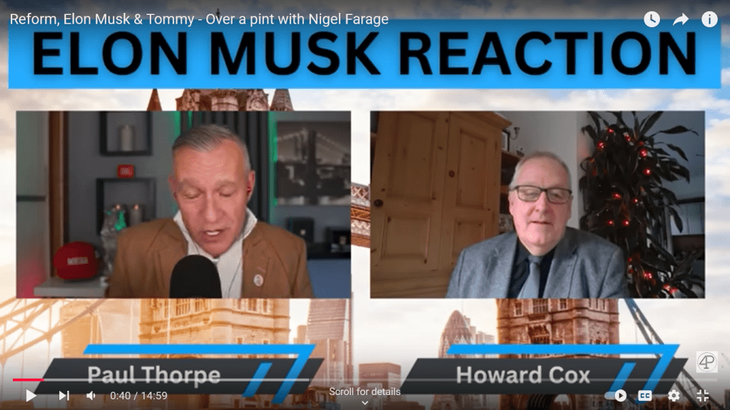 I confess I don’t know much about the two men featured in this video, Paul Thorne and Howard Cox, but I enjoyed their exchange of perspectives following Reform supporter, Elon Musk’s Tommy endorsement. Cox is an ardent supporter of Reform and Nigel Farage who hitherto has distanced themselves from Tommy Robinson in his quest for power. All this is relevant given Reform are currently the most significant opposition voice, but might do well to join others including Tommy, expressing similar concerns.