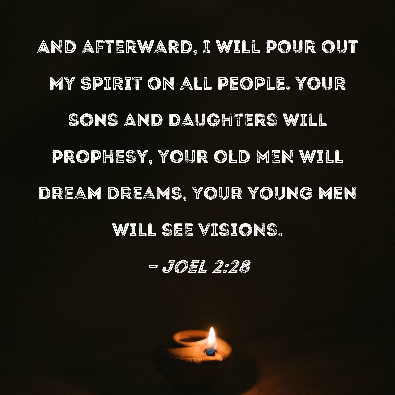 Joel’s prophecy was partly fulfilled on the first Day of Pentecost following Jesus’ resurrection, when the promised Holy Spirit descended on Jesus’ disciples. Undoubtedly, many in the two thousand years that followed, have experienced the Holy Spirit such that the young did see visions and the old did dream dreams. But the expectation is for there to be a lot more to come.