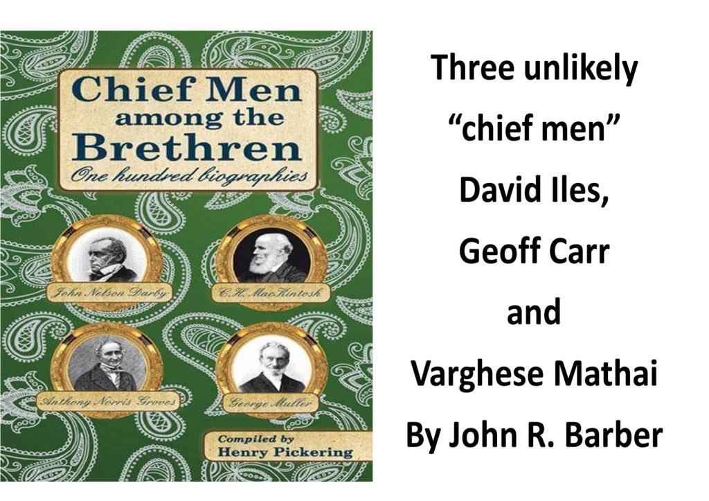 The author, with his lifelong association with the Open Brethren (his own background is “middle of the road”, yet in touch with many “Brethren” who aren’t), has identified three unlikely “chief men” he argues fulfils Pickering’s selection criteria and methodology. All were born after Pickering’s second edition (1931) and are no longer with us. All had many dealings with the author and were widely recognised as “chief men” inside and outside the Brethren: