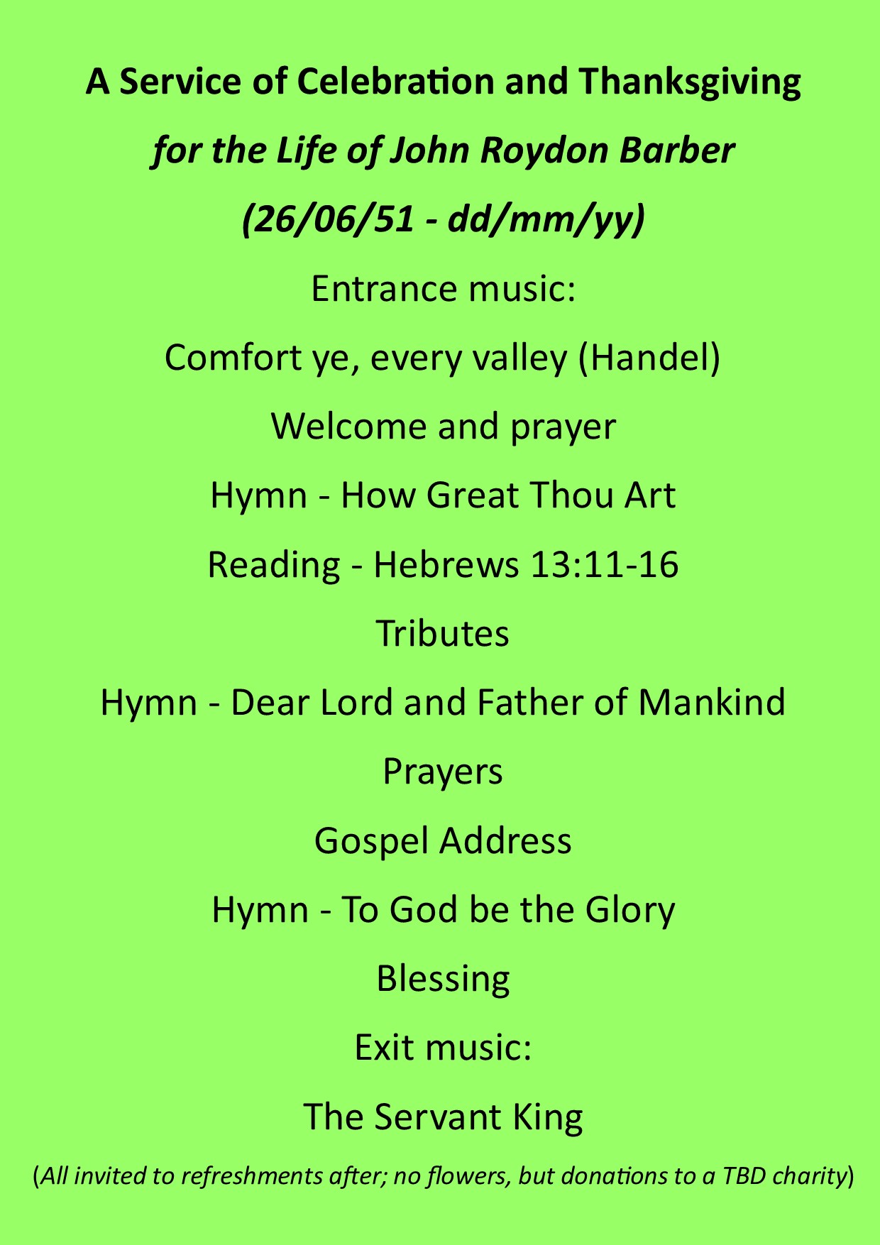 Regarding the funeral, having attended many services (and even conducted a few myself), especially in my later years, and mindful that however sad is the loss that after a short period of mourning few are likely to give the deceased much further thought and life simply goes on. In my plan, I decided on a short private burial, followed by a memorial service at my church, followed by a decent wake (best held conveniently at the church so regrettably without the champagne on me). I think of the bad calls I have made in life (along with some good ones) but am grateful for my family and friends for sticking with me and that God is ever gracious and has blessed me in so many ways. Going back to the funeral that triggered these thoughts, I end with a suggested draft order of service for those responsible, using as a template that for the dear lady who died (above) and the sort of message (below) those crazy folk who carry sandwich boards might share but which is ever so important.