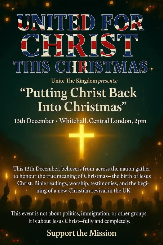 The “Put Christ Back into Christmas” event is happening this Saturday, December 13, 2025, at Whitehall, Central London, starting at 2 pm.
