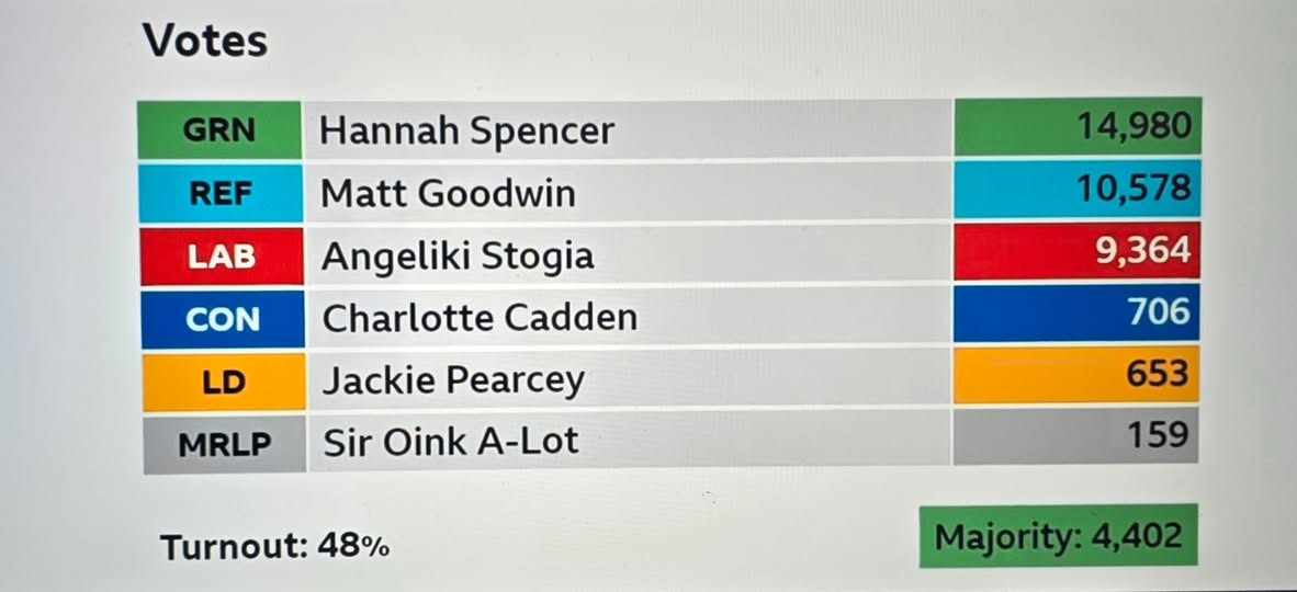 What took place was a by-election and the Green Party won by a convincing majority, with Reform coming a fair bit behind and just in front of Labour (who had won what was then considered as a safe Labour seat, in 2024), followed by, and a long way behind, the Conservatives and Lib Dems and, last of all, the Monster Raving Loony Party. If there was any surprise, it was not the electorate’s order of voting preferences but rather the size the Green majority.