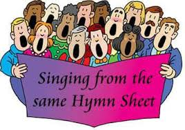 According to AI: “Singing from the same hymn sheet” is a British idiom meaning people are on the same page, sharing the same goals, values, or message. It originates from church services where everyone sings from the same hymnbook.